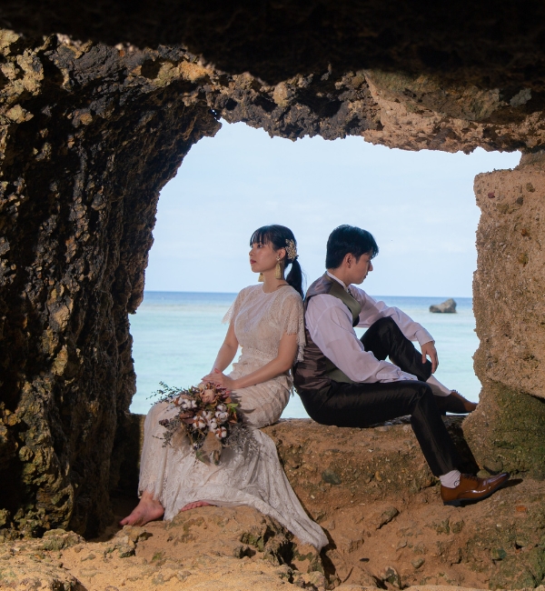 <Plan Contents> ドレス&タキシード / 和装or琉装 / アートブーケ&ブートニア / 小物一式 / ヘアメイク / ビーチロケーション 写真撮影 / 撮影時ロケ地使用料 / 写真データ付き / 写真アルバム付き / 青空/美肌/小顔等の補正